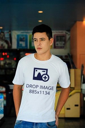 White T-Shirt Mockup – Male Posing Chinese Lamps